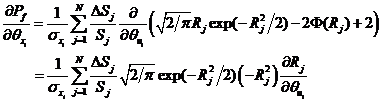 在5.1節(jié)中已經(jīng)給出了原坐標(biāo)空間轉(zhuǎn)換成標(biāo)準(zhǔn)正態(tài)坐標(biāo)空間的失效概率的計算公式,因此可靠性試驗靈敏度的求解方法可由復(fù)合函數(shù)求導(dǎo)法則寫成下面的形式。