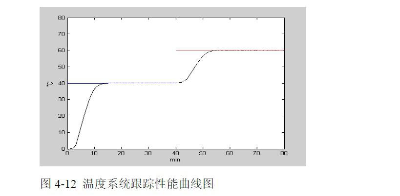 輸出變量經(jīng)過模糊判決后輸出的控制量在0—1 之間,表示各個執(zhí)行器的運行功率與運行功率的比值。采用對數(shù)型激活函數(shù)而沒有用模糊神經(jīng)網(wǎng)絡(luò)的輸出直接作為最終輸出的目的是為了讓執(zhí)行器能夠平滑過渡,減少磨損,延長使用壽命。環(huán)境試驗箱溫度系統(tǒng)仿真結(jié)果環(huán)境實驗箱在初始時刻設(shè)定跟蹤溫度為 40℃。在40 分鐘后設(shè)定為60℃。,誤差在2℃以外采用強制加熱或強制冷卻,在距離跟蹤目標(biāo)的誤差在2℃以內(nèi)啟動模糊控制策略,系統(tǒng)動態(tài)跟蹤性能如圖所示: